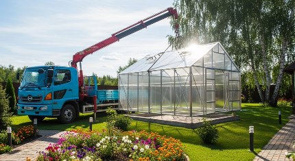 Для парников спецтехника не нужна — всё можно доставить на легковом автомобиле или в багажнике. Однако если парник большой (например, 6×3 м) и выполнен из поликарбоната, манипулятор упростит подачу листов и каркаса на участок.